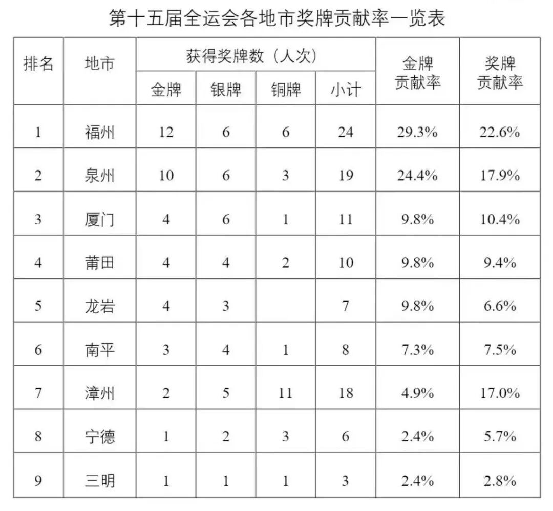 本届全运会上,福建9个设区市均有奖牌入账,形成了 “核心引领、多点辐射、全域共进” 的均衡发展格局。各地市立足资源禀赋,打造特色体育名片,共同撑起了福建竞技体育的一片天。