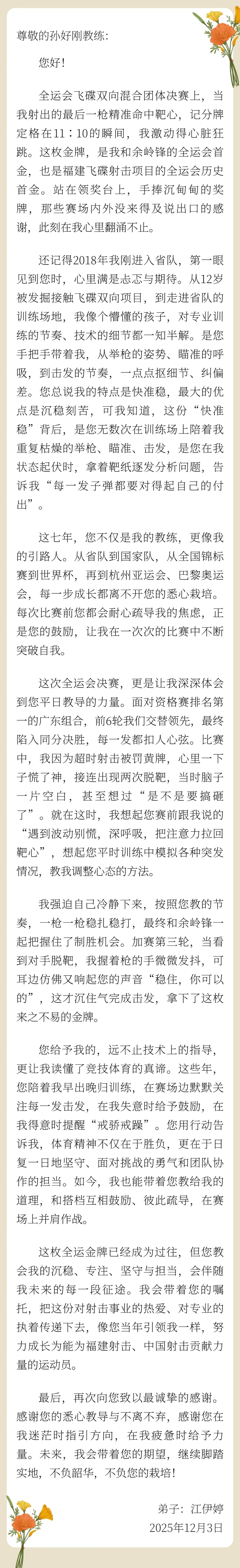 《“全运冠军致谢教练”书信系列》