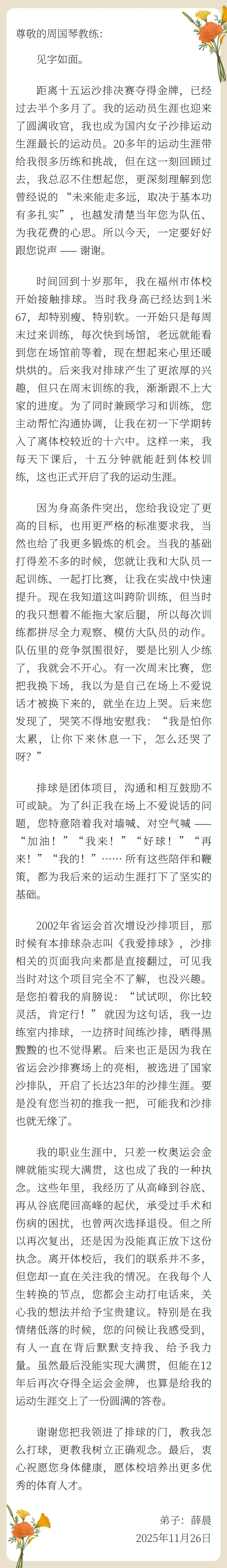 为致敬这份默默耕耘的师者情怀,福建体育微信公众号特别策划 “全运冠军致谢教练” 书信活动,邀请我省全运冠军执笔,将赛场上未说尽的感谢、训练中难忘的点滴,化作一纸温情书信,献给那些与他们共同拼搏、见证成长的教练,让全运荣光与深厚师徒情谊在字里行间延续,让更多人看见荣誉背后双向奔赴的热爱与坚守。